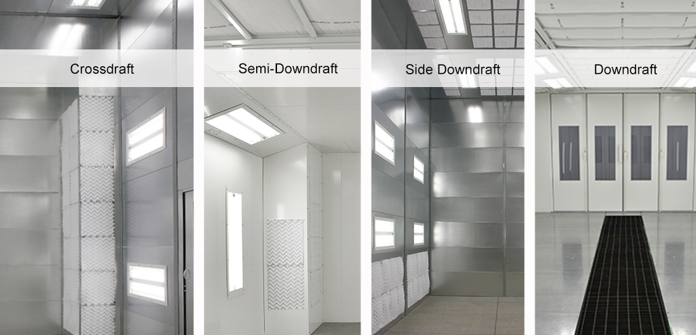 In crossdraft and semi-downdraft paint booths, the exhaust plenum is located at the rear of the spray booth. In side downdraft pigment booths, filtered frazzle plenums are located on both sides of the spray booth.