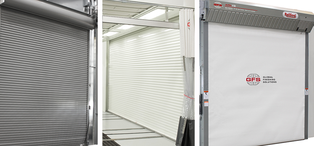 RollSeal Doors from Global Finishing Solutions (GFS) control contamination and airflow between bays. These doors are most useful when at that place are space restrictions or when included in a Side-Load Finishing Arrangement. They use a triple-layered material and airtight seal to prevent overspray from escaping the paint booth. Air between layers of the fabric helps maintain desired heat levels inside the spray booth to encounter cure temperature requirements.